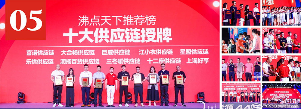 本次大會(huì)期間舉辦了沸點(diǎn)天下推薦十大供應(yīng)鏈?zhǔn)谂啤⑿铝闶垲I(lǐng)域影響力人物頒獎(jiǎng),沸點(diǎn)天下優(yōu)選供應(yīng)鏈聯(lián)絡(luò)處授牌,及最有溫度資源最深的社群授牌。