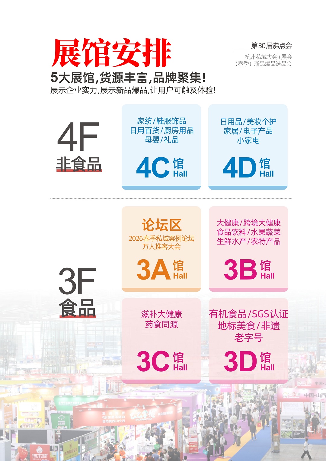 此次杭州沸點會,將啟用杭州國際博覽中心6大展館:3A/3B/3C/3D/4C/4D,總面積超5萬平米,1000+家優質參展商,10000+新品爆品展出,98%私域頭部渠道現場選品。