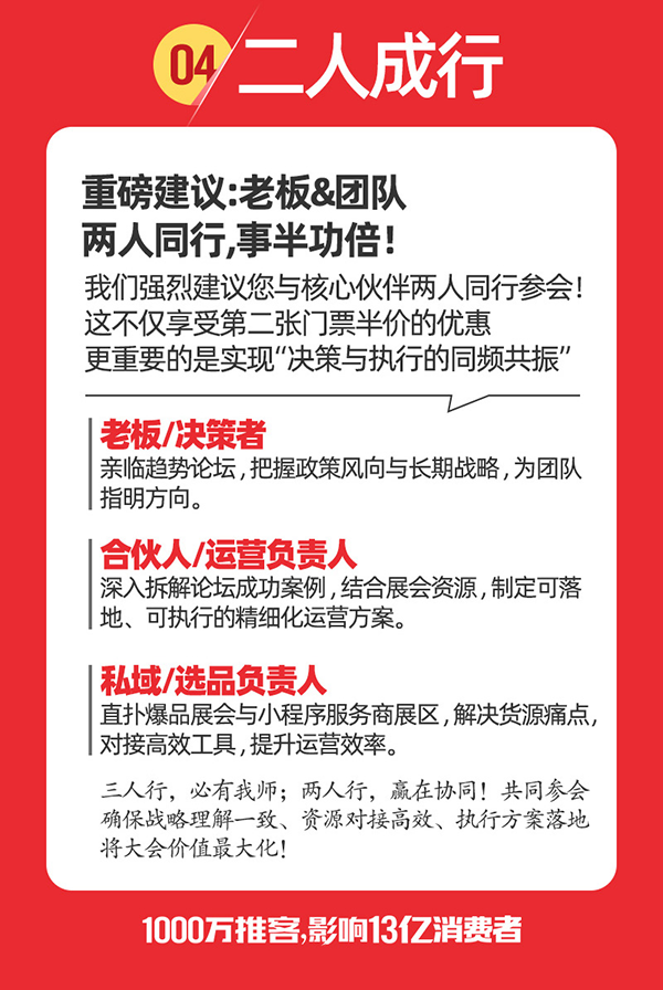 與過去的微商、團購團長不同,推客不再是簡單轉發產品信息,而是要通過內容建立信任,實現高效轉化。直播和短視頻將成為推客的核心推廣手段!本次大會特別邀請頭部主播、短視頻達人、公眾號及小紅書博主現場創作內容,幫助推客掌握內容營銷的秘訣,打造個人IP,提升推廣效果!