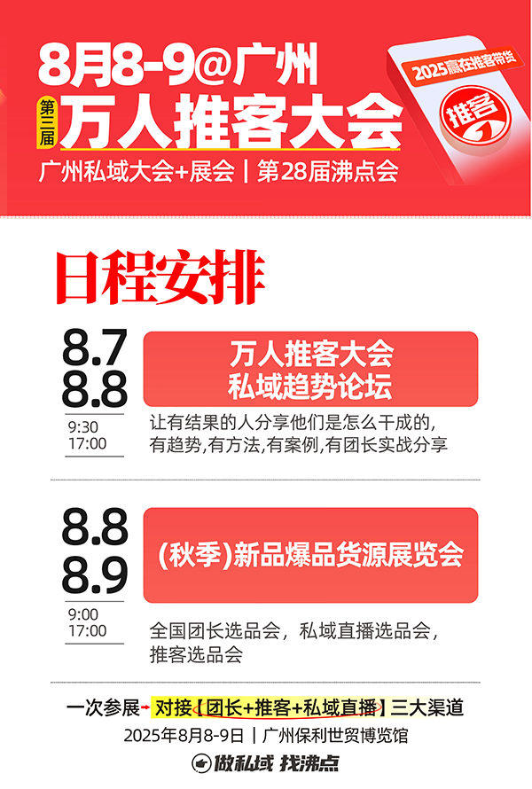 由沸點會舉辦的2025廣州萬人推客大會定于8月7-9日在廣州保利世貿博覽館舉辦!活動由6個館組成!二天論壇+二天展會!解決大家關注推客的怎么干的經驗方法問題,以及資源對接問題!