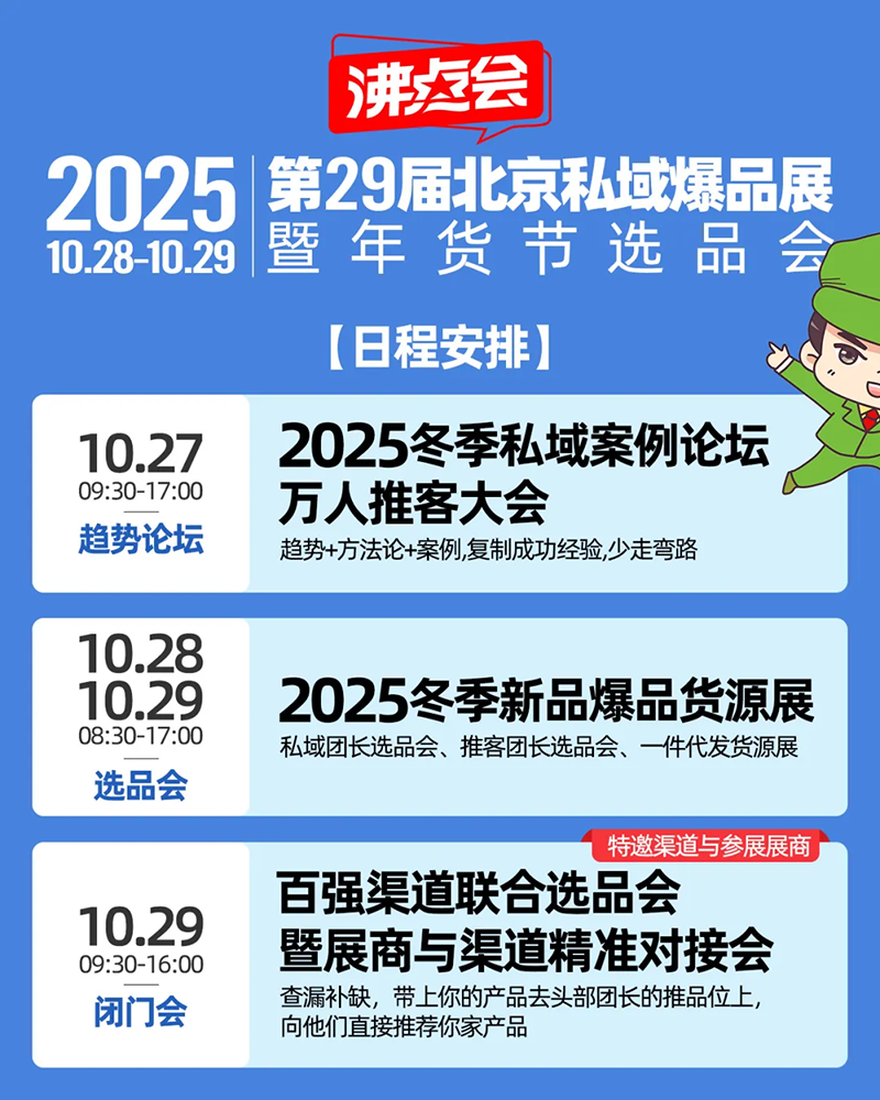 2025年10月28-29日,由中國私域生態領先平臺——沸點會主辦的第29屆北京私域爆品展暨年貨節選品會,將于北京·中國國際展覽中心(朝陽館) 隆重舉辦!